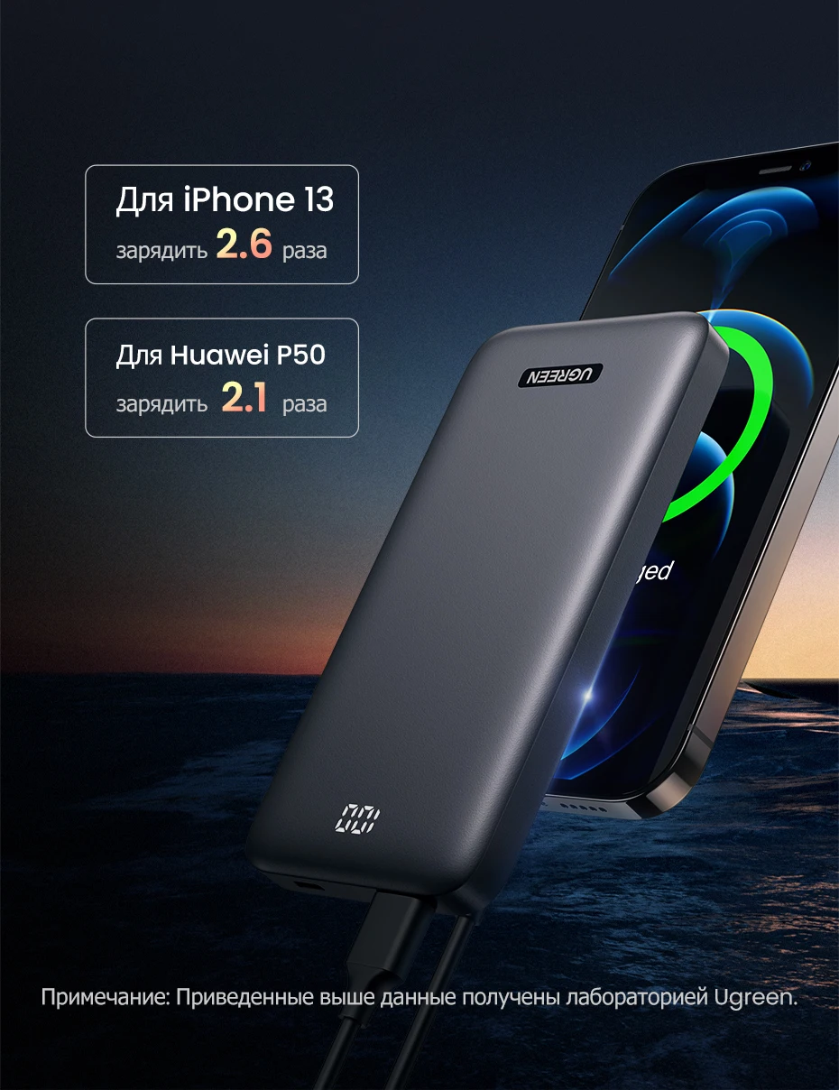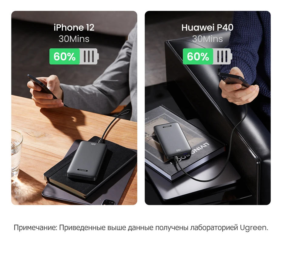 El cargador de teléfono portátil UGREEN carga dos puertos de salida de carga rápida. El puerto tipo C admite carga y recarga rápida 3.0 de suministro de energía de 20 W, la potencia de salida máxima puede alcanzar 5 V/3 A, 9 V/2,2 A, 12 V/1,5 A, cargando un iPhone 12 del 0 % al 60 % en 30 minutos y recargado completamente en 3,3 h.