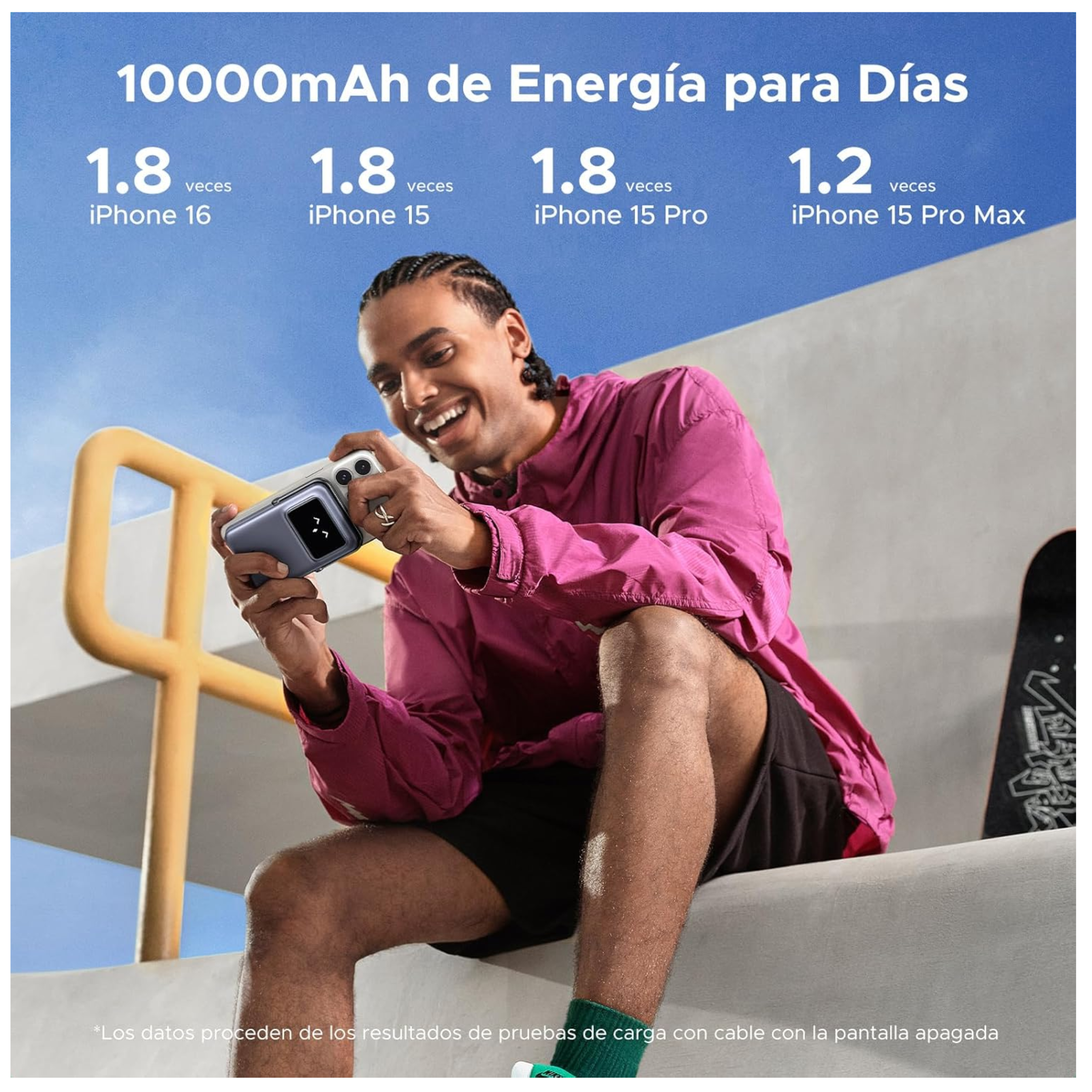 - 10000mAh Capacidad: Batería portátil tipo c su diseño es extremadamente compacto pero equipado con batería de alta capacidad, puede cargar la mayoría de los teléfonos y tabletas 1 ~ 2 veces, puede cargar iPhone 16 1,8 veces y iPhone 15 Pro 1,8 veces a través de cable. Así que usted no tiene que preocuparse por quedarse sin batería iPhone